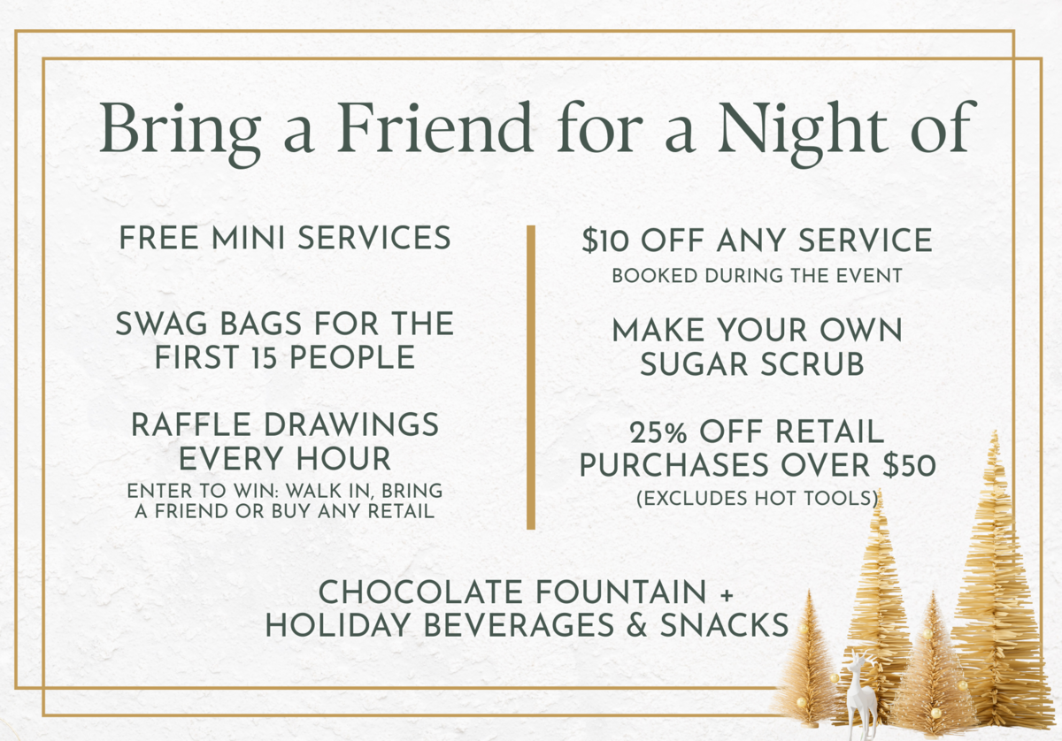 Bring a friend or family member and get an exclusive sneak peek at our Christmas Retail collection! Enjoy an evening filled with seasonal treats, including a chocolate fountain, while you browse our holiday offerings. Plus, experience a taste of luxury with our complimentary mini services.